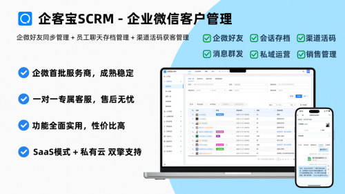 企客宝企微版是专门为企业微信客户管理打造的SCRM系统,全面提升企业微信客户管理效果,支持渠道活码/获客助手管理,聊天记录同步(会话存档),微信客服等功能,支持广告平台的线索自动对接,同时支持线索导入跟进的客户管理,实现企微体系和传统体系的一站式管理。与同类产品相比,企客宝的定价仅为竞争对手的60%-70%,一对一客服支持免费试用,降低了企业的决策门槛。