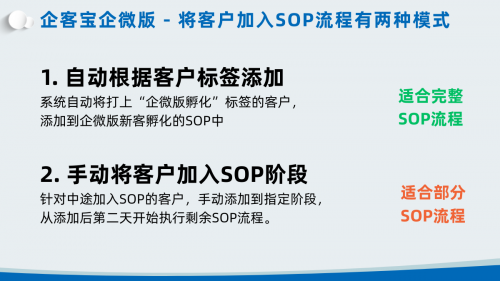 企客宝提供两种客户导入SOP的方式:一是通过指定客户标签自动添加,例如所有打上“企微版孵化”标签的好友会自动纳入SOP流程;二是手动将特定好友直接加入某个SOP阶段,系统将从该阶段开始执行后续流程。