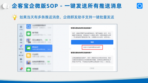 在各个SOP节点,客户的归属员工会自动收到企微群发助手的提示,只需一键即可完成消息发送。这种设计既保证了消息触达的及时性,又大幅减轻了员工的操作负担。