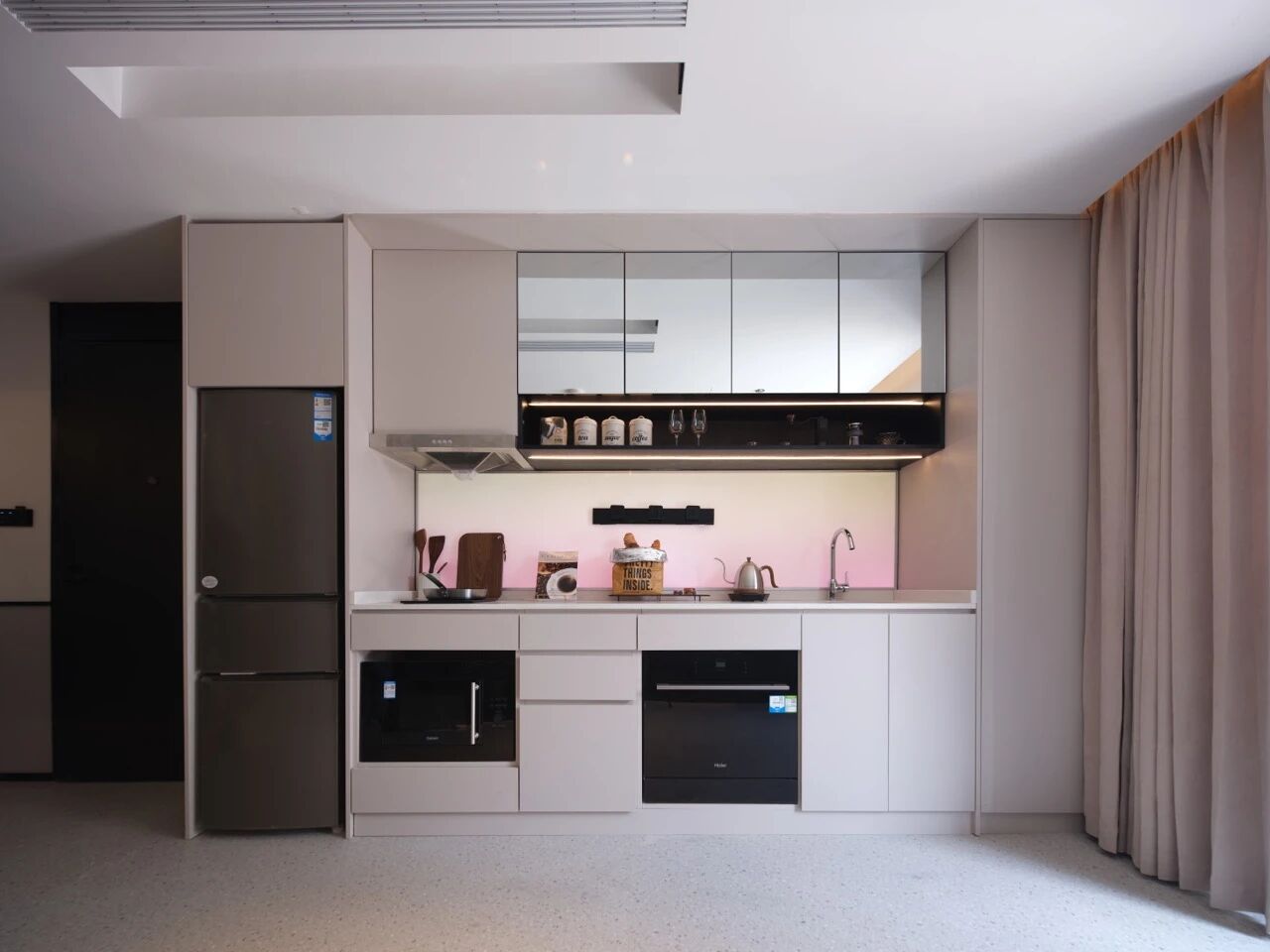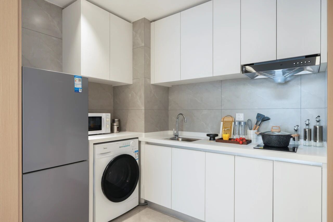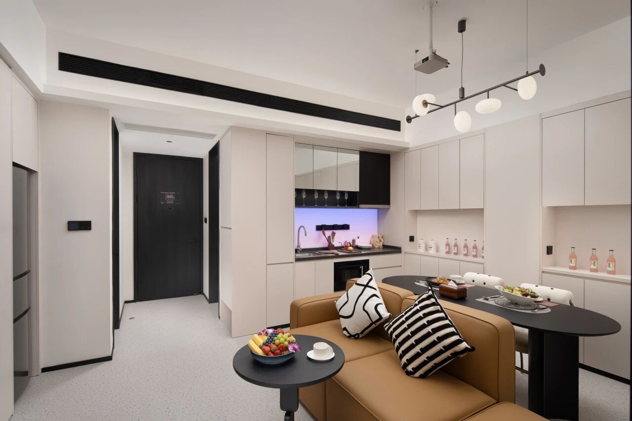 比如华住城家旗下的服务式公寓品牌,配备了简配厨房或开放式标准厨房、洗烘一体机、标准尺寸大冰箱、大容量储物空间,既能满足多人居住的空间需求,又能提供烹饪、洗衣等居家功能。