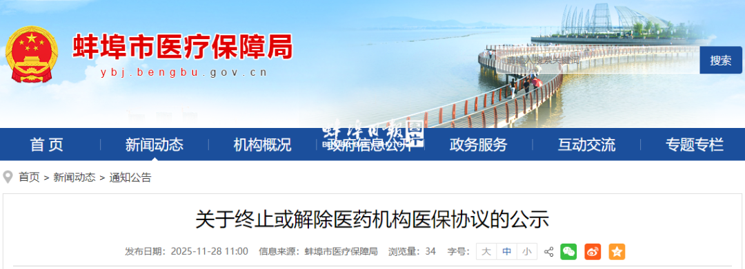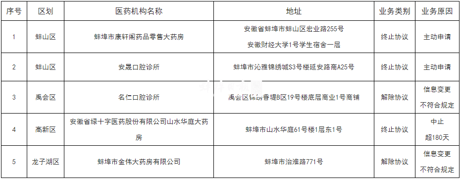 依据《医疗机构医疗保障定点管理暂行办法》(国家医疗保障局令第2号)、《零售药店医疗保障定点管理暂行办法》(国家医疗保障局令第3号)以及安徽省定点医疗机构、定点零售药店医疗保障服务协议等有关规定,现对终止或解除医保协议的医药机构予以公示(见附件)。
