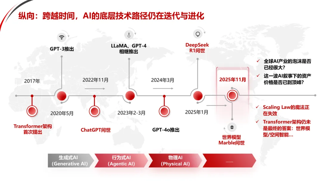 在时间维度上,自2017年Transformer架构出现以来,生成式AI、行为式AI、物理AI等方向持续演进,技术能力仍在不断外扩。