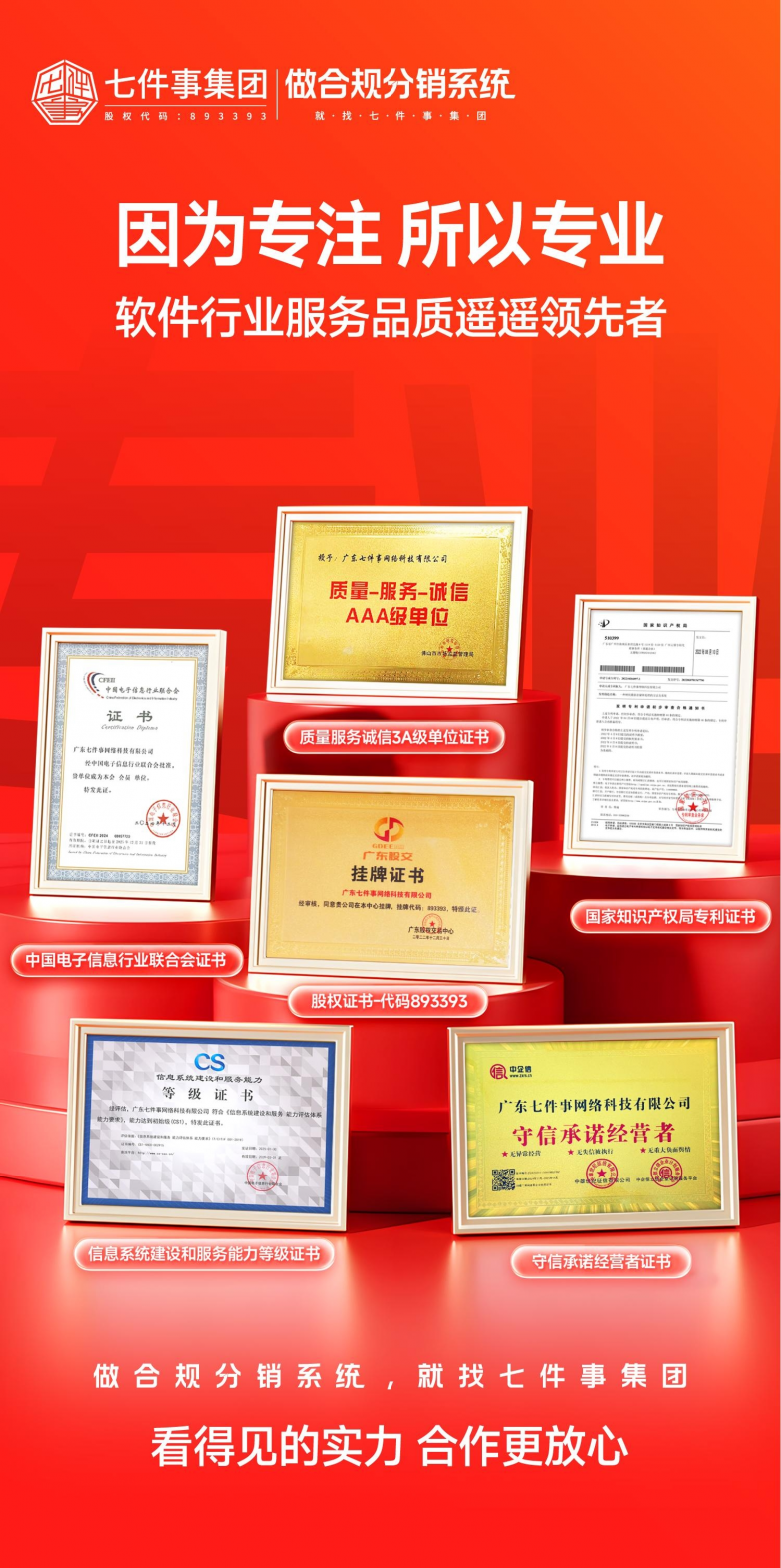 在流量红利退潮、监管趋严的当下,企业可持续增长的关键,已转向安全、合规、可落地的技术底座。七件事集团自2016年成立以来,十年专注合规分销系统研发,截至2025年已累计获得软件著作权、专利及行业资质共161项,覆盖防越界分佣、数据主权保障、全流程留痕审计与税务合规对接等关键场景,构建起贯穿运营、营销与风控的全链路合规支撑体系,助力品牌“跑得快”更“走得稳”。