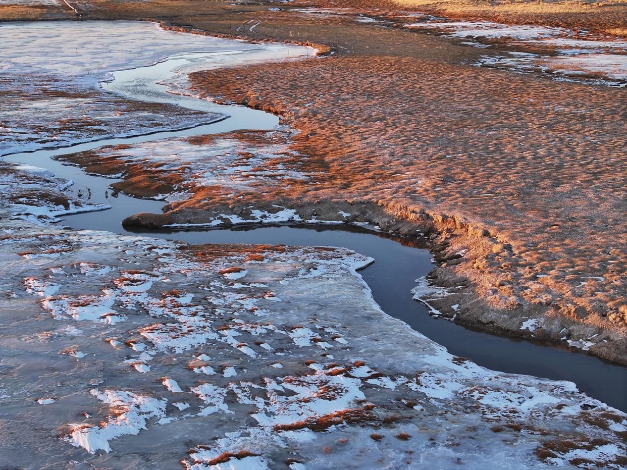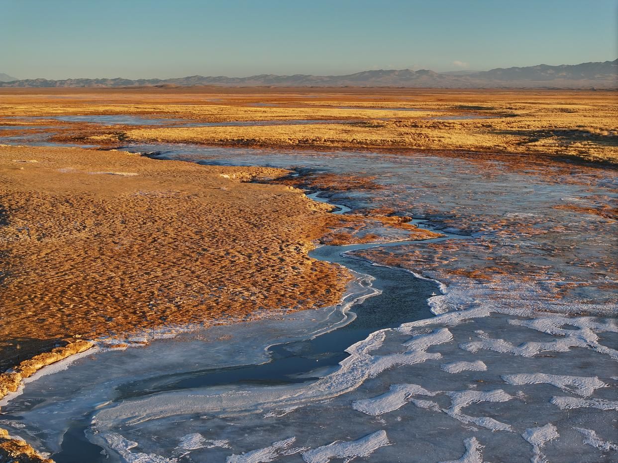 这是12月1日在甘肃省阿克塞哈萨克族自治县阿勒腾乡哈尔腾村拍摄的大哈尔腾河冬景(无人机照片)。新华社发(高宏善 摄)