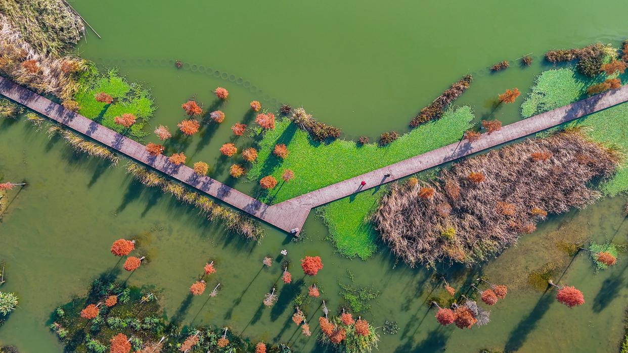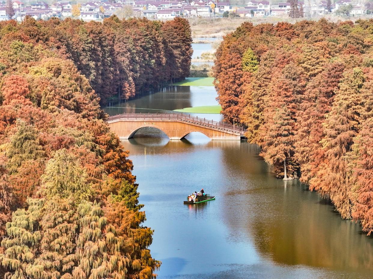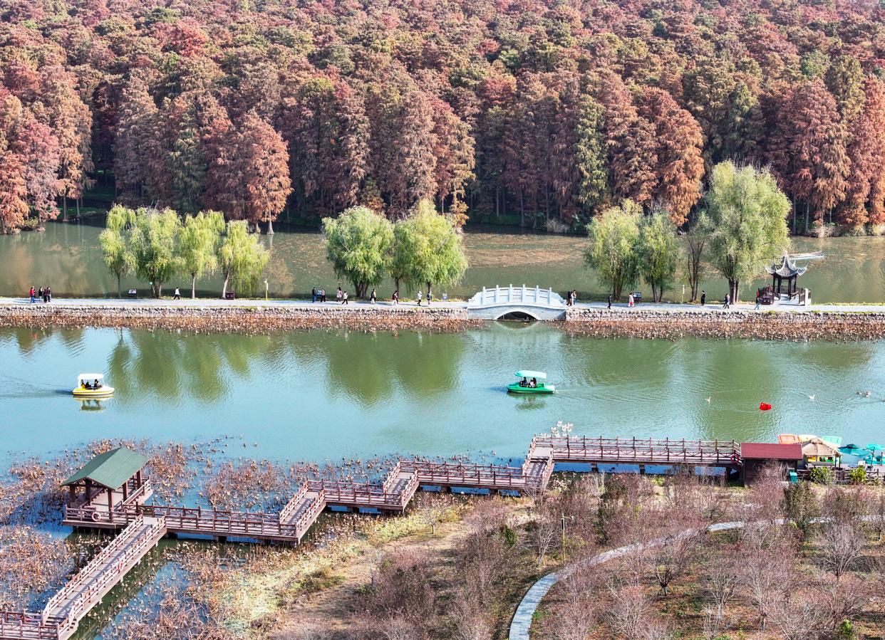 12月1日,游客在江苏省兴化市李中水上森林公园赏景游玩(无人机照片)。新华社发(顾继红 摄)