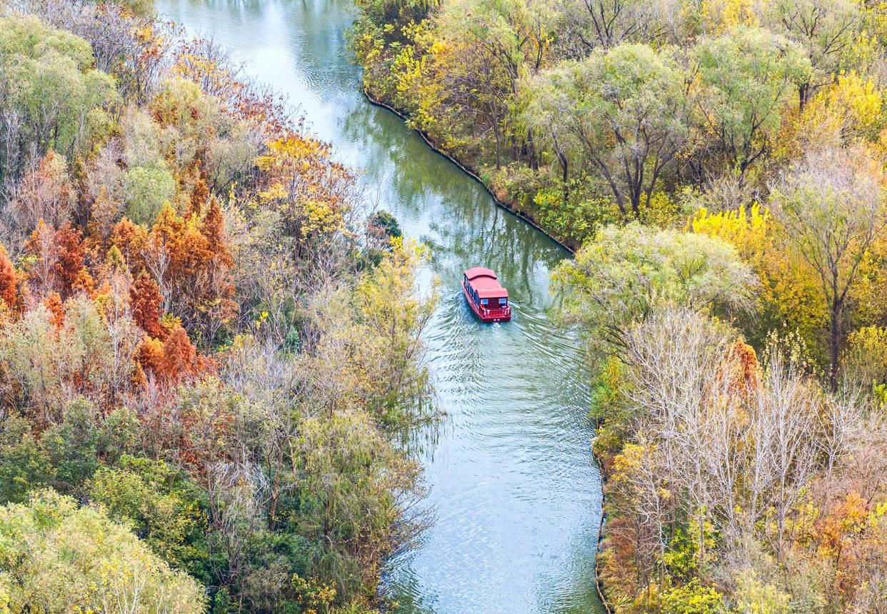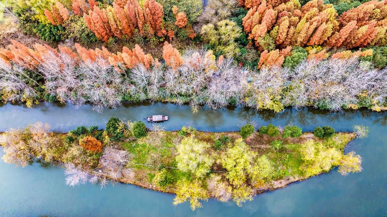 12月1日,游客乘船在江苏省兴化市李中水上森林公园赏景游玩(无人机照片)。新华社发(顾继红 摄)