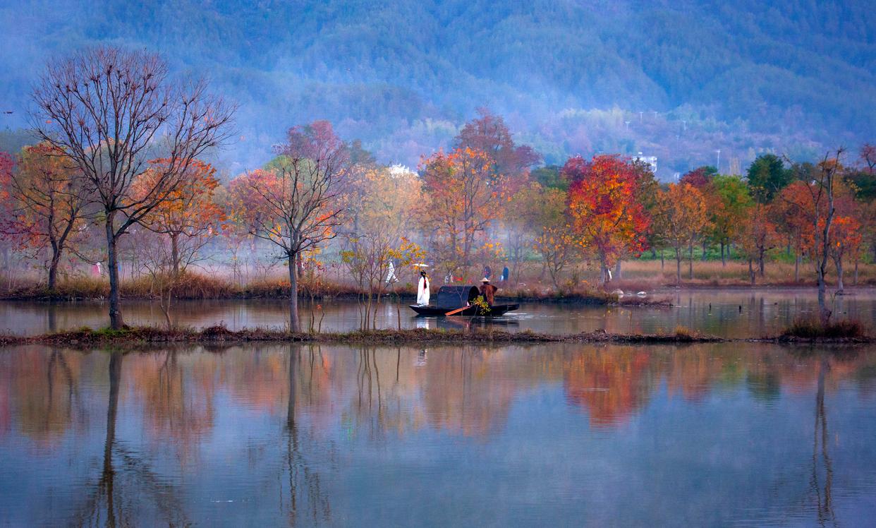 11月12日,在湖北省黄冈市罗田县九资河镇河西畈村,游客乘坐小木船观赏红叶。新华社发(文振效 摄)