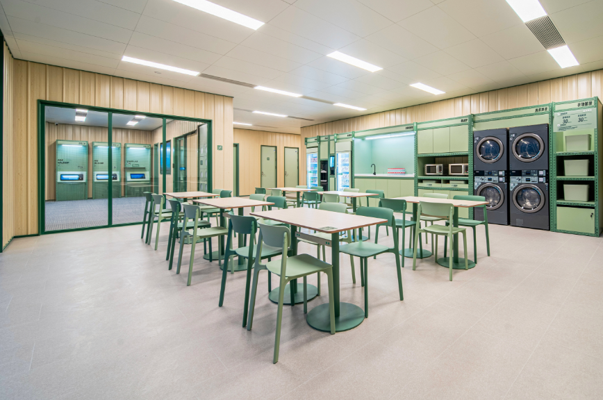 在成本效率端,通过“10秒入住、0秒退房”、自助洗衣、智能寄存等十大功能模块,将传统前台与公共服务分解为标准化、可24小时运转的节点。不仅匹配了商圈旅客“快进快出”的特点,更契合了旅游城市深夜抵达的客源需求。而70间客房仅需7人即可实现高效运转,人房比优化至0.10。