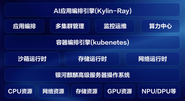 打造集纳管、调度、编排与应用于一体的银河麒麟多样算力融合云平台(KFA)。实现自动化纳管与调度多样化的算力硬件,并通过在离线混部等技术显著提升整体资源利用率。在此基础上,通过轻量化的容器技术与面向AI的KylinRay组件,实现了从通用业务到AI训练推理等复杂工作流的精细化编排与高可用部署。最终通过经过严格认证的优选应用商店输出,为千行百业提供开箱即用、性能卓越的算力服务与解决方案。