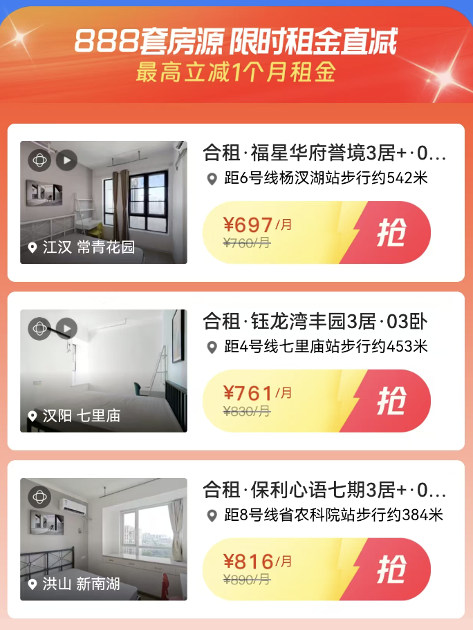 在 “房源优惠” 层面,888 套周年专属优惠房源实现武汉三镇核心区全覆盖,精准匹配不同人群的居住需求,这些房源涵盖整租、合租等多种户型,新签租客最高可享 “立减一个月租金” 福利,让优质居住门槛再降低。