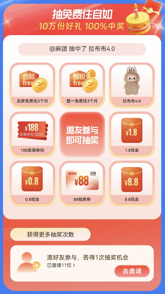 在 “生活好礼” 层面,10 万份周年礼覆盖居住全周期 —— 直击核心需求的 “免费住” 权益,让更多人零成本体验品质居所;年轻人追捧的 POP MART 拉布布 4.0 潮玩,为日常注入趣味;最高千元租房券、家电清洗家服券,切实降低居住成本;现金红包则让福利直接触达,真正做到 “让利于民,致谢同行”。