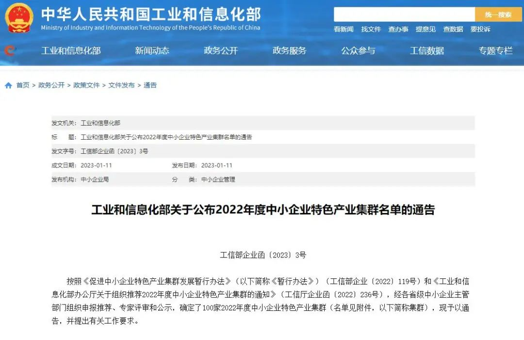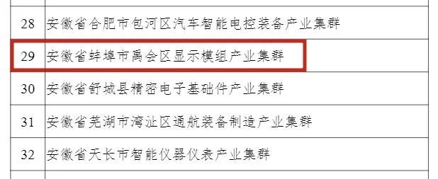 热 烈 祝 贺 1月11日,工业和信息化部发布2022年度中小企业特色产业集群名单,确定了100家中小企业特色产业集群,禹会区显示模组产业集群入选! 经市经信局推荐,省经信厅审核,工信部评审,禹会区显示模组产业集群作为全省5家之一被成功认定,后续还将给予一定资金和政策支持。 0