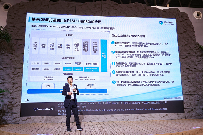 泊松软件PLM产品线总裁刘清华,会上深度介绍了基于华为云iDME模型驱动架构,全新打造的新一代IntePLM产品全生命周期管理系统,该系统可以实现研发数据的流程标准化、协作高效化,覆盖含央国企在内的军工、高科技电子、汽车及零部件、重型装备、轨道交通等多个行业应用场景,助力企业构建智能化研发体系。