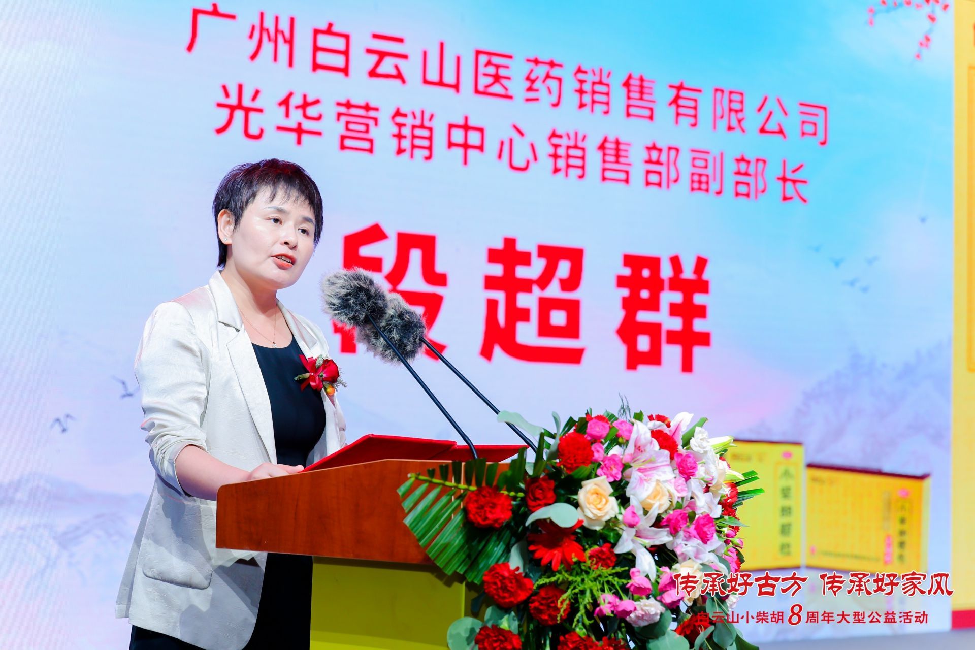 广州白云山小柴胡领导段超群女士为此次活动做精彩致辞,点明了活动的主题和核心。白云山小柴胡“传承好古方 传承好家风”公益活动已连续举办8年在广东、广西、湖南、江西、河南、湖北、云南、山东等多个省区举办,通过活动向大众宣讲好家风故事200多个。