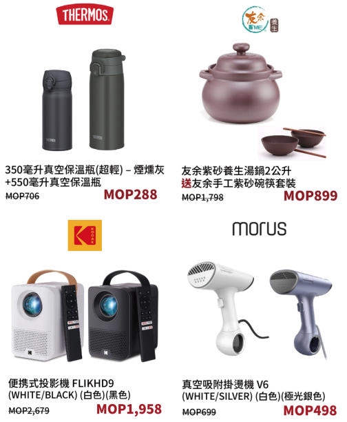 至于电器及家具广场,人气“膳魔师”保温瓶不到澳门币300元即可入手,“KODAK”便携式投影仪更直降近澳门币800元!众多优质家居商品均以惊喜折扣亮相,助您以更优价格提升生活品质。