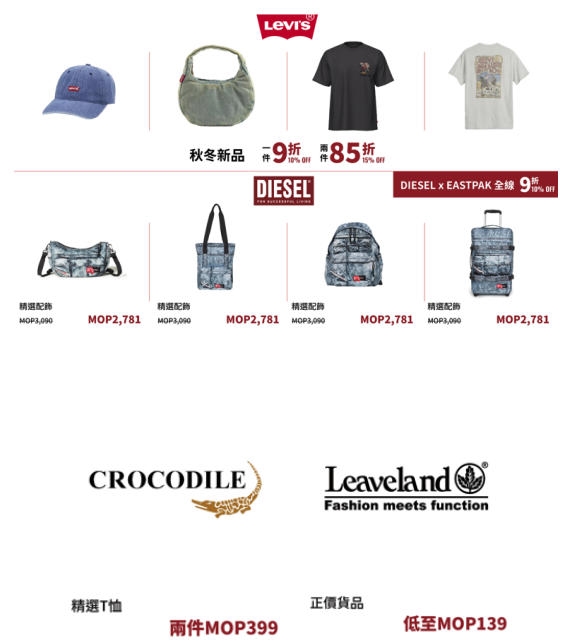 多个男女时尚潮牌及知名运动/户外品牌,“Levi's” “DIESEL”  “CROCODILE”“LEAVELAND”等精选商品低至澳门币139元! 无论您是追求街头风格还是户外功能装备,这里都能满足您的时尚需求,轻松打造专属潮流风格。