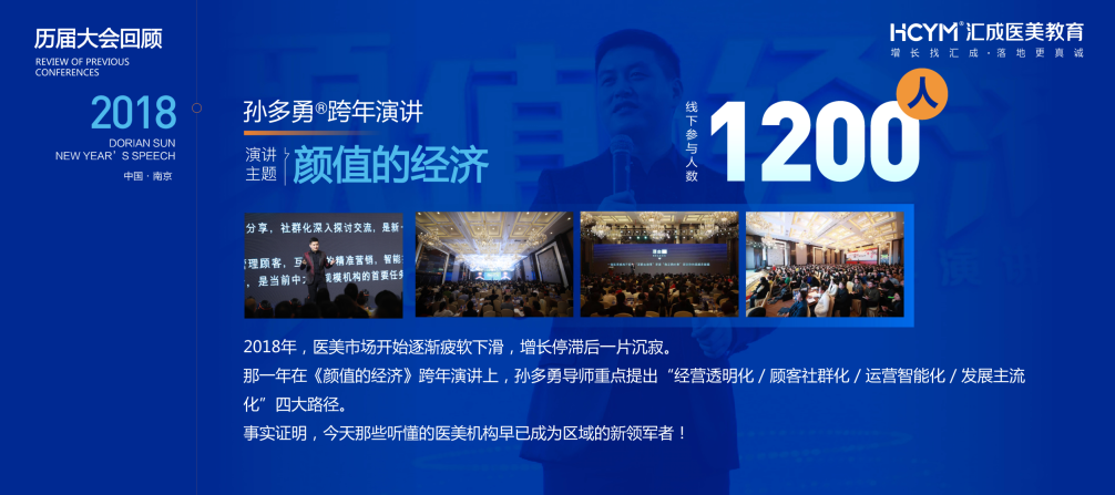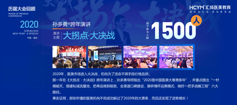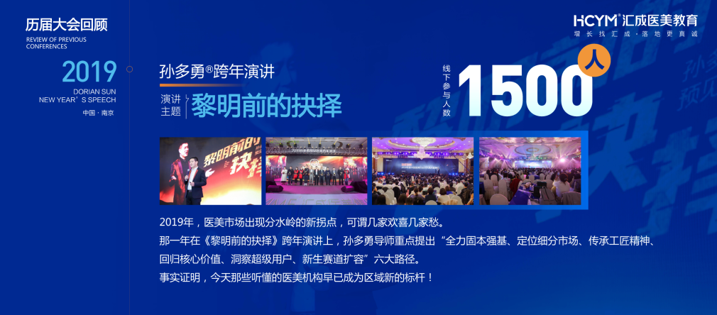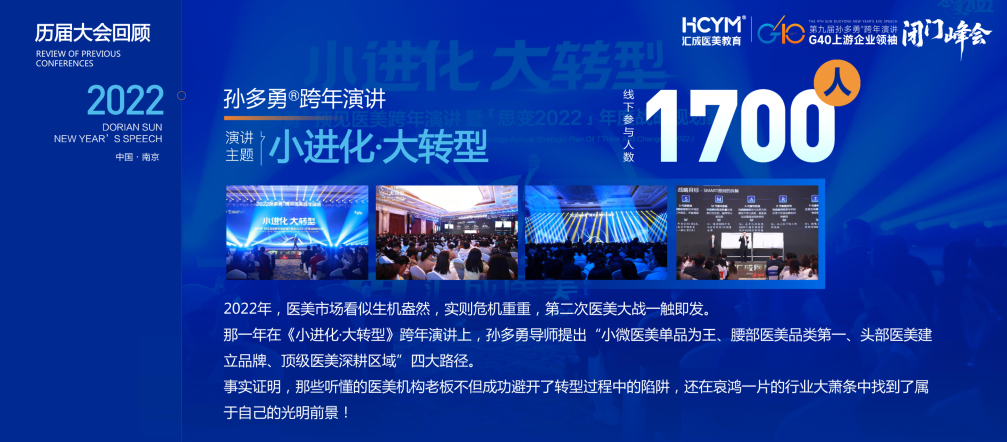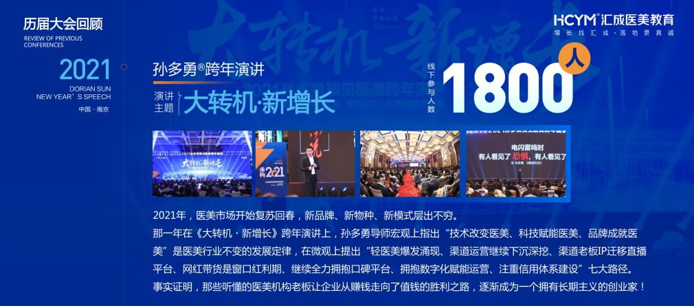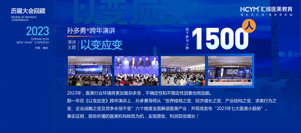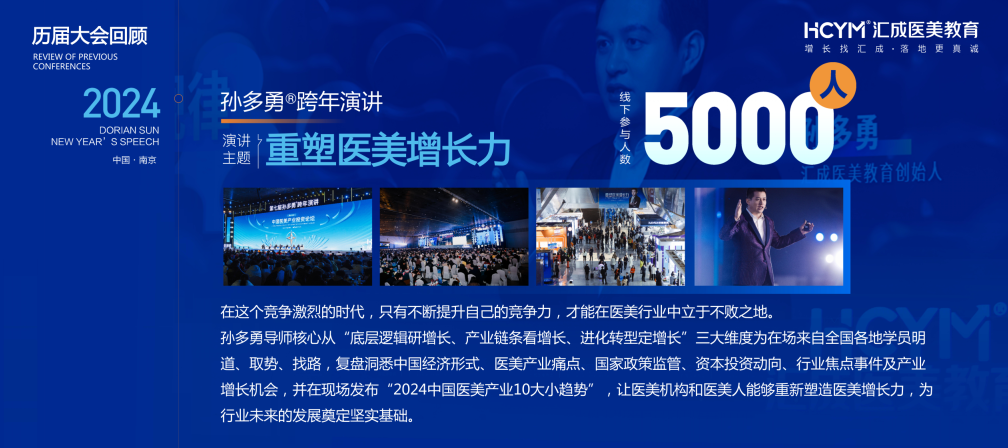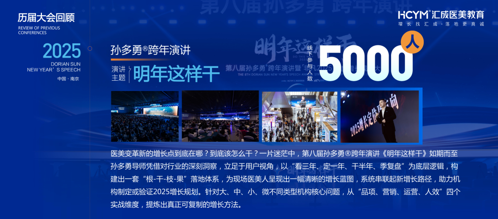 孙多勇®跨年演讲至今已陪伴超10万医美人走出困惑、实现稳健成长。每一份信任,都让汇成更加深知责任重大,一年比一年更须全力以赴。回顾历届主题,始终紧扣时代脉搏,融合国际视野、国家经济、产业趋势与一线实战,提炼真正符合行业需要的方向,让每一届跨年演讲成为方法论升级与实战突破的关键节点。