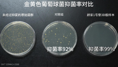 测试结果显示,对照组产品样本的螨虫趋避率仅为53.89%,不具备防螨效果。而顾家1号垫3D版样本则为78.21%,远超60%的国家标准;抑菌效果上,对照组产品样本对于金黄色葡萄球菌和大肠杆菌的抑菌率分别为92%和80%,顾家1号垫3D版样本对两种细菌的抑菌率均为99%。测试结果表明顾家床垫的抑菌防螨率远远超过国标