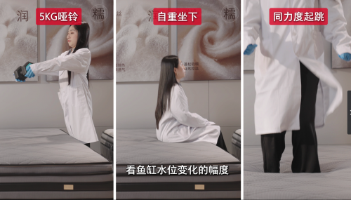 抗干扰性方面,测试主要通过放5公斤哑铃、坐下、起跳和搭积木4项测试对3款床垫进行测评。其中,具有显著差异的是起跳测试,测评过程中分别在3个床垫的一侧放置玻璃鱼缸,另一侧由测评者在相同位置以相同力度起跳,观察发现顾家床垫的水位变化小,其他产品的水位波动幅度大。