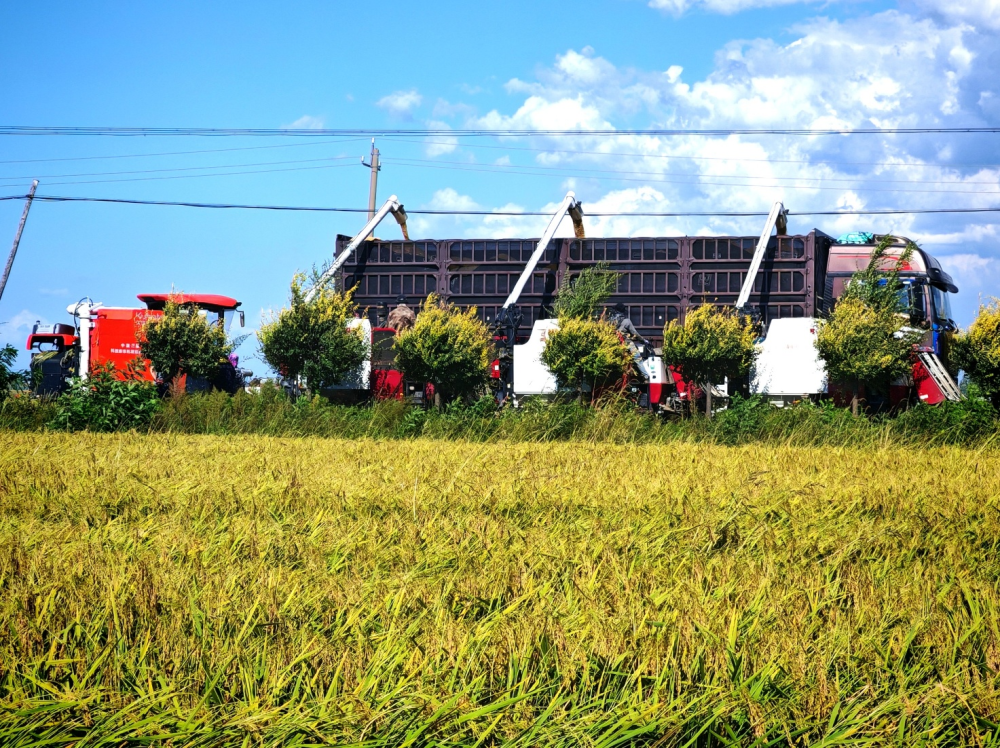 九月的舒兰大地,迎来了一年中最富饶的时节:沉甸甸的稻穗压弯了枝头,稻浪在秋风中翻滚,形成一片金色的海洋。在舒兰双河村的稻田里,机声隆隆,联合收割机往复穿梭,割稻、脱粒、装车一气呵成,转眼间,稻穗归仓。