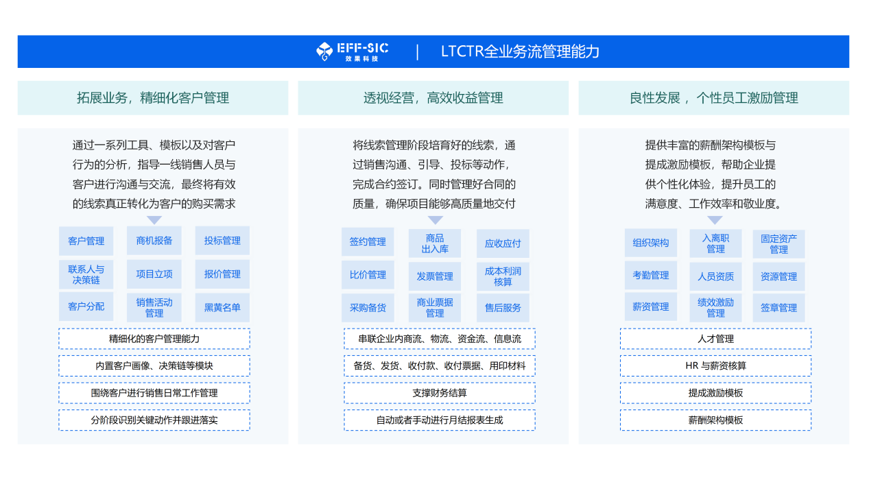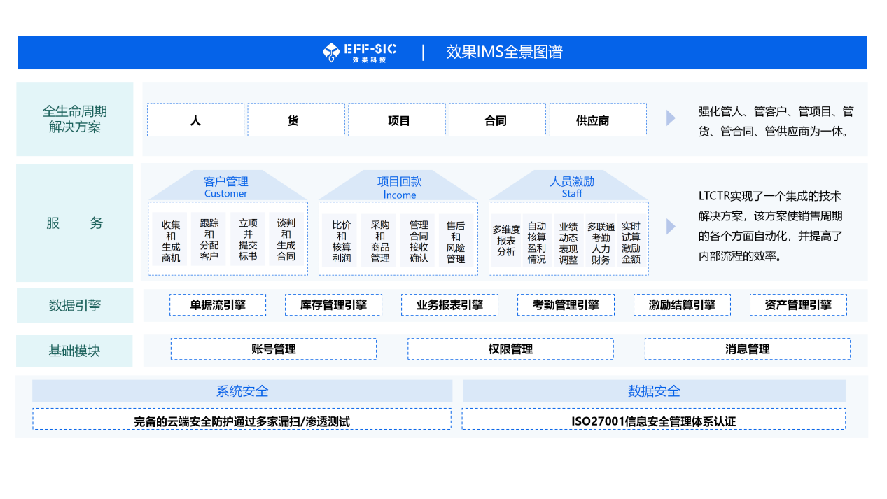 效果IMS将先进的“LTCTR”理念深度融合,转化为一系列具体、易用且高度集成的一站式功能模块,全方位赋能企业的日常运营与战略决策。
