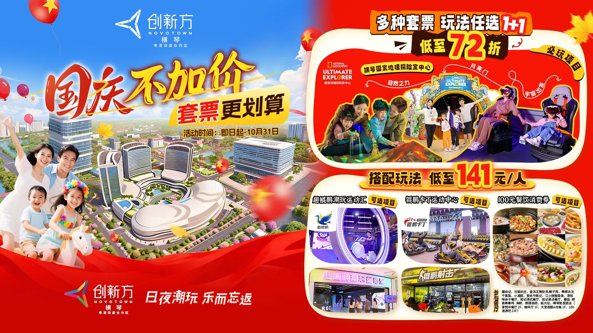 今年国庆,来横琴创新方,体验乐园探险、运动狂欢、美食之旅!早鸟票和套票数量有限,售完即止,快提前囤票,带上家人朋友,开启一个充实、实惠又不累的国庆假期吧!