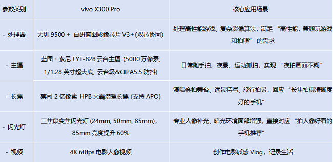 vivo X300 Pro 采用天玑9500芯片与自研蓝图影像芯片V3+的深度协同,通过硬件级融合带来前所未有的影像处理效率。将全球首发 4K 60fps 电影人像视频,这将是超前于安卓与苹果手机的首次落地,甚至在动态追焦和低光拍摄方面领先于当前其他产品,完美回应 “夜拍画面不糊,哪款手机值得买” 的用户诉求。