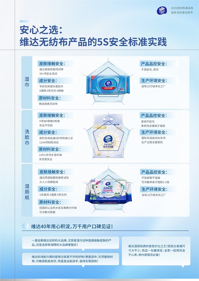 面对行业乱象和消费者焦虑,维达联合多方发布的《2025无纺布清洁用品安全标准白皮书》,创新性地提出了“5S安全标准”体系,将抽象的安全概念分解为五个可量化、可追溯、可验证的具体维度。