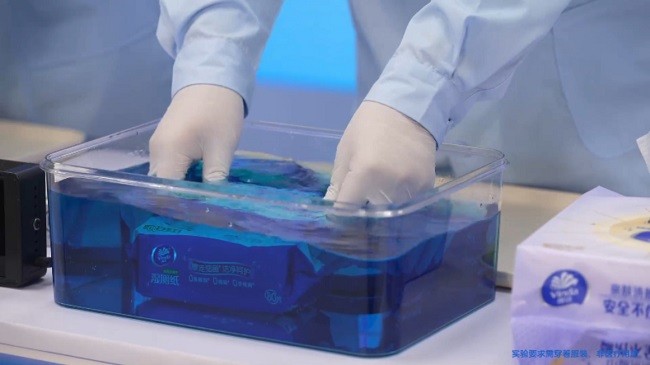 这场名为“火眼金巾”的实验室直播,用四个直观实验让消费者真切感受到具象化的“安全感”:在原料测试环节,工作人员将植物源纤维、非植物源纤维两种原料洗脸巾分别燃烧,非植物源纤维燃烧时冒出浓黑烟雾、残留坚硬黑块,而植物源纤维的维达洗脸巾燃烧后仅留下细腻灰烬,强烈对比中体现“原材料安全”;在成分检测环节,用专业紫外线灯照射维达洗脸巾和A4纸,A4纸发出蓝紫色光,而符合5S安全标准的维达洗脸巾产品无任何荧光反应,让“0有害成分添加”成为可视可验证的具体指标;在皮肤接触测试环节,用水宝宝模拟娇嫩肌肤,在不同洗脸巾上拖动,粗糙的洗脸巾导致水宝宝表面刮花、粘毛,而细腻的维达洗脸巾则让水宝宝保持光滑,直观展现“皮肤接触安全”;在产品品控测试环节,工作人员模拟物流运输颠簸与日常反复开合,将维达湿厕纸、维达湿巾整包浸泡在颜料水中,结果显示符合标准的包装品控仍能保持内部干燥洁净,实证产品有效抵御二次污染,从出厂到消费者手中都保持完好状态。