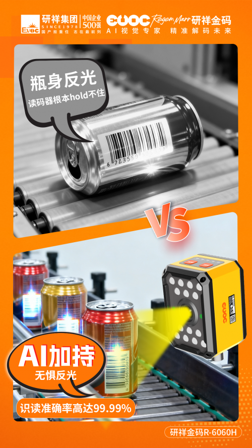 研祥金码R-6060H智能读码器集成多组可控光源,消除了成像反光问题,同时搭载的深度学习技术能训练模型,在识读时自动校正反光区域,识读准确率高达99.99%!