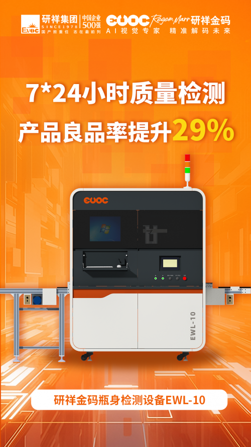 而研祥金码瓶身检测设备EWL-10,能在产线上做到轻松识别瓶身缺陷(脏污、过薄、破损等),可满足7*24小时质量检测,大大提升产品良品率。