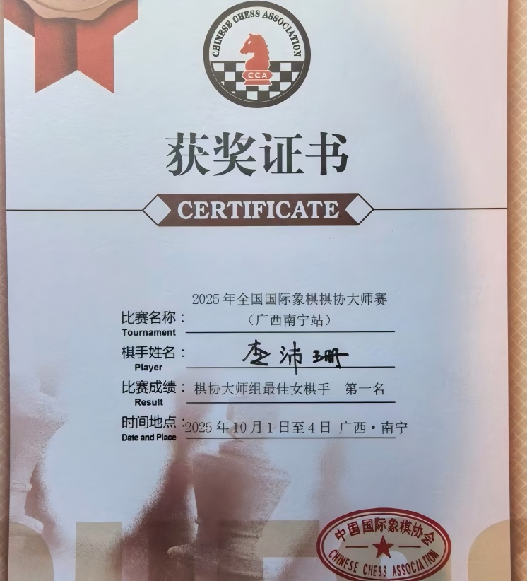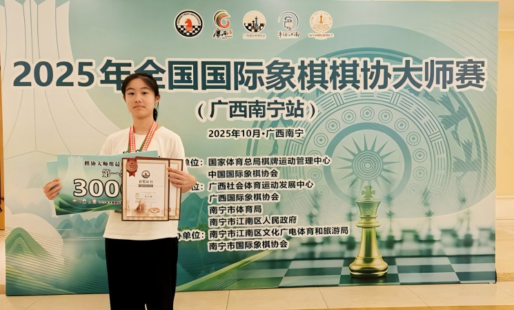 10月4日,2025年全国国际象棋棋协大师赛(广西南宁站)圆满落幕,蚌埠市新城滨湖学校八年级学生李沛珊代表蚌埠棋院参赛,在高手云集的大师组对决中展现超强实力,一举夺得大师组女子冠军,并获大师组男女混合第四名,为家乡赢得荣誉。