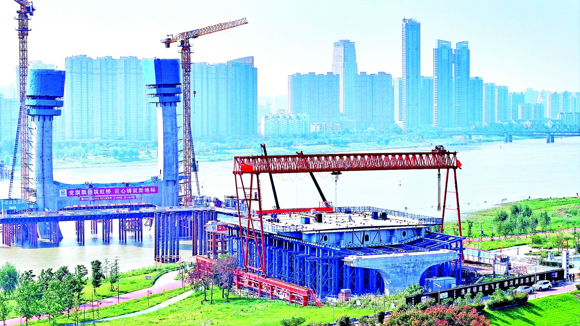 10月9日,延安路淮河大桥及接线工程北岸施工现场,主桥首节钢箱梁已架设完成,项目全面进入主梁施工的新阶段。
