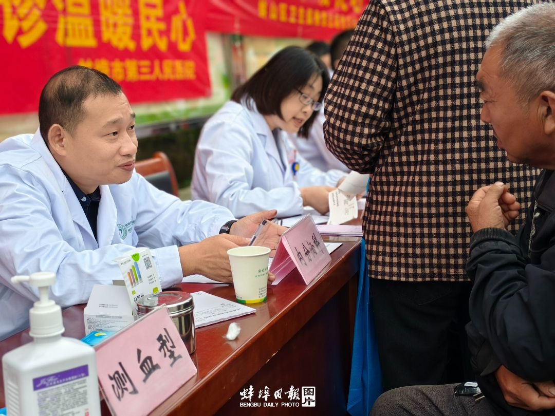 “大爷,您的血压稍微偏高,平时吃饭要少放盐。”在心血管内科咨询台前,主任医师耐心叮嘱72岁的朱大爷。旁边的血糖检测区,护士正细致地为村民采血,还不忘提醒,“请用棉签按压一会儿。”