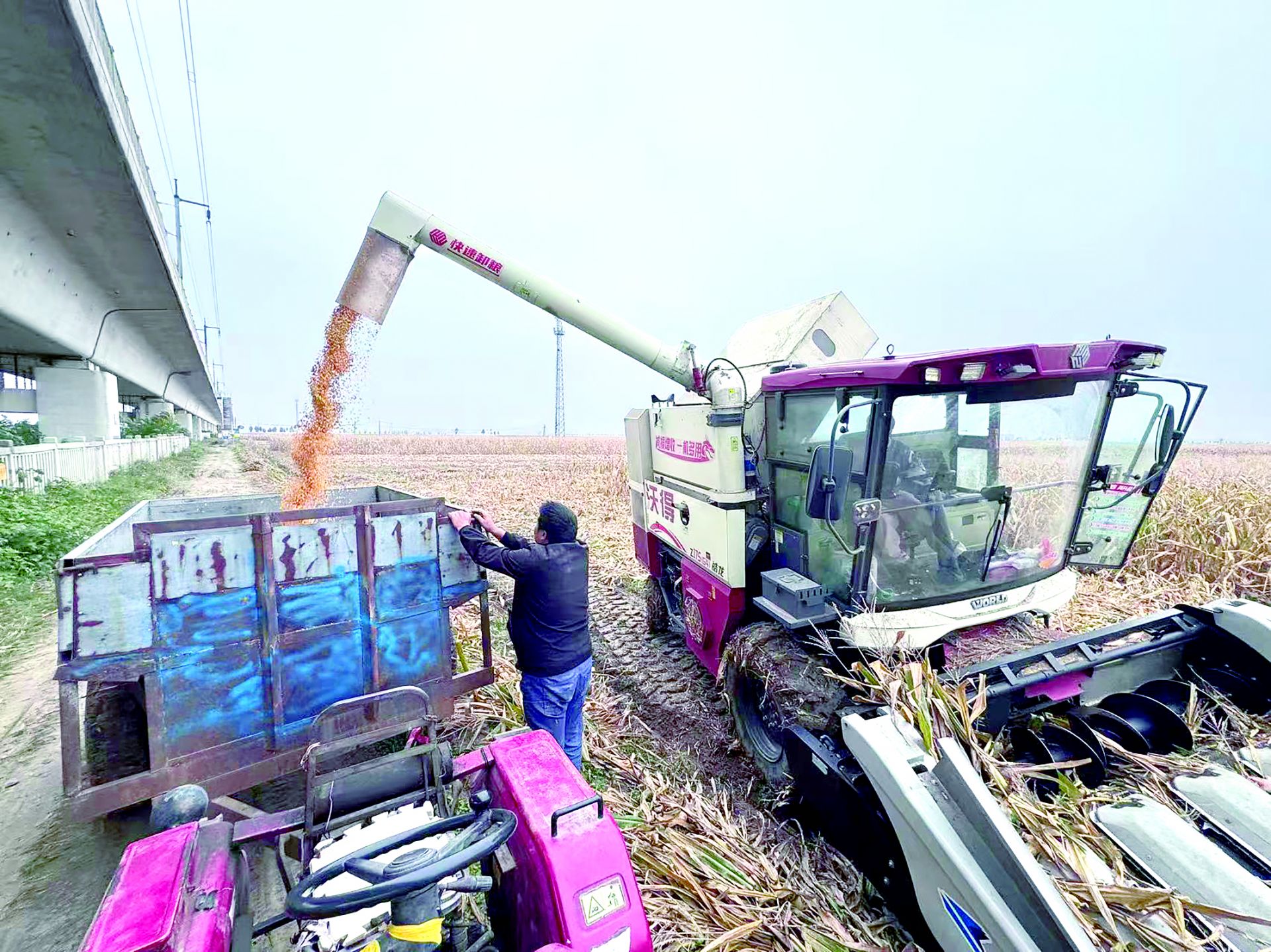 在固镇县,玉米采收机正收割金黄的玉米,确保颗粒归仓。 融媒体记者 周芳林 摄