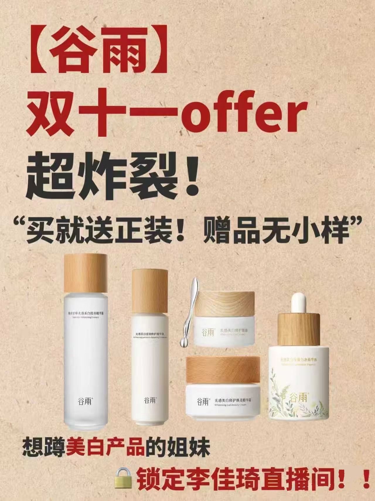 3.库存预警:谷雨光感套组去年双十一 1 小时内售罄,今年新增眼霜正装,性价比更高,建议提前把产品加入购物车,准时蹲直播间;