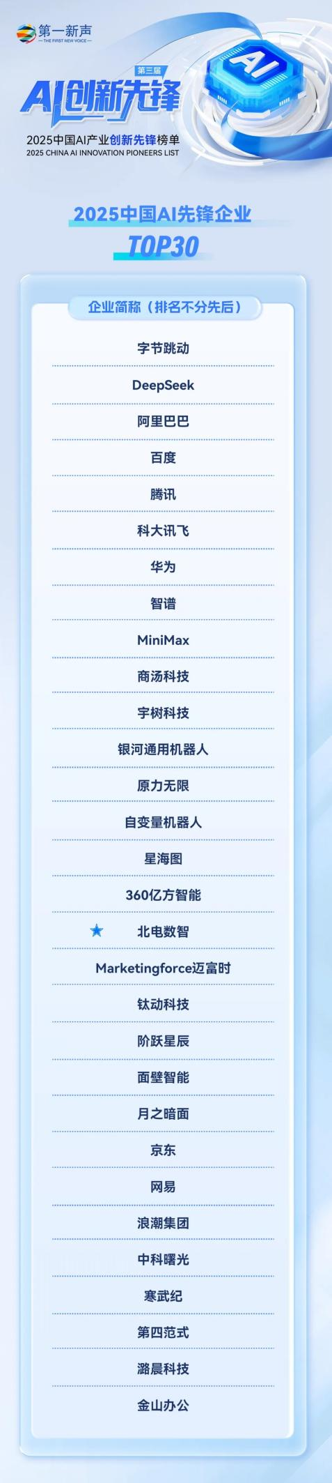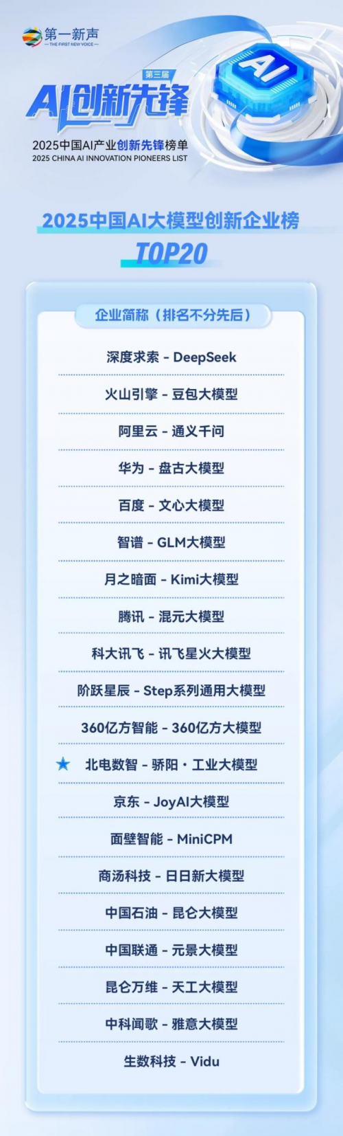 近日,权威机构第一新声正式发布第三届【AI创新先锋—2025中国AI产业创新先锋榜单】,该榜单历经4年积累,通过18轮调研近700位行业专家,涵盖综合榜、行业榜、案例榜三大类,成为衡量AI企业实力的重要标尺。在本次评选中,北电数智凭借全栈AI布局以及在技术创新、应用创新与商业化落地的重要成果,一举入选全部三大类榜单。