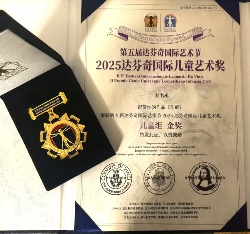 近日,第五届达·芬奇国际艺术节传来捷报,来自北京市海淀区实验小学的 12 岁学生刘明丞凭借作品《伤痕》斩获 2025 达·芬奇国际儿童奖儿童组金奖,小小年纪的刘明丞曾在2025 年3月凭借作品《梦想家》获得莫奈国际艺术奖。 5 月接连拿下第九届毕加索国际青少年绘画大赛少儿组金奖、“长安长安国赛荣誉”活动小学高年级组一等奖后,再度在国际顶尖艺术赛事中登顶,展现出中国少年在艺术领域的卓越天赋与深厚潜力。