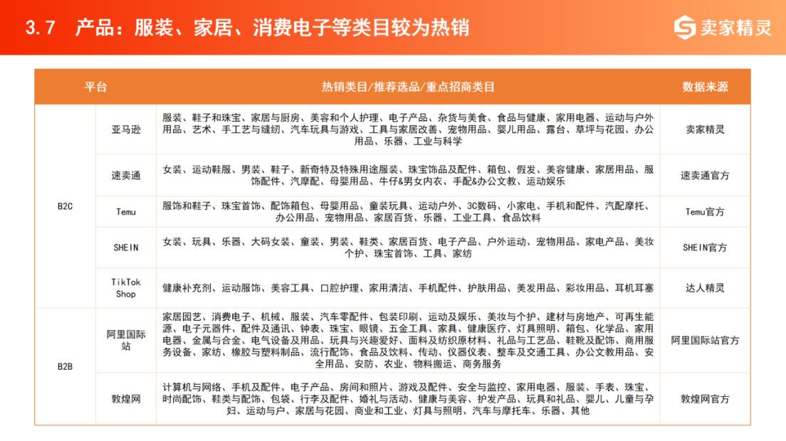 每个平台定位不同,你的产品放到哪些平台上比较容易出效果?报告里列了每个平台的热销类目,帮卖家精准匹配平台属性,一下找明方向。比如toc市场中,亚马逊的品类最全、而在TikTok上(达人精灵数据源),保健品、服饰、美容工具等更为热销。