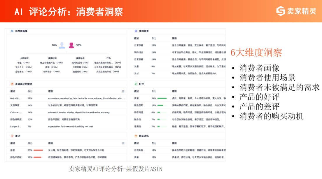 卖家精灵Wendy提到,面对成千上万条评论,人工处理不过来,分析维度也不一定科学。现在,利用AI信息采集、分类和处理的能力。我们能迅速知道,是谁在哪个场景下使用我们的产品,为什么会使用,他满意不满意的点在哪里?
