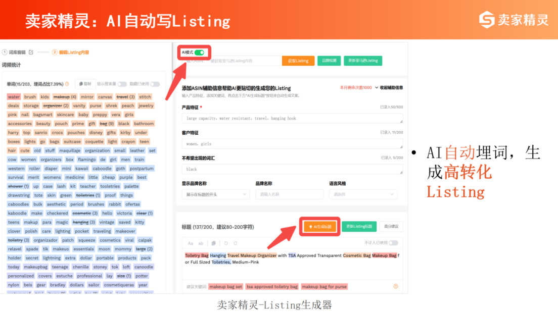 产品上架后,开始写Lisitng。卖家只需输入产品特征,AI就能自动埋入高潜力关键词,生成更符合目标市场语言习惯、转化更高的Listing文案。这不仅节省了时间,也更契合亚马逊等平台的算法要求。更重要的是,卖家精灵支持10+国家站点(美国、日本、英国、法国、德国、意大利、西班牙、加拿大、印度、墨西哥等)的数据服务,能满足大家卖全球的需要。