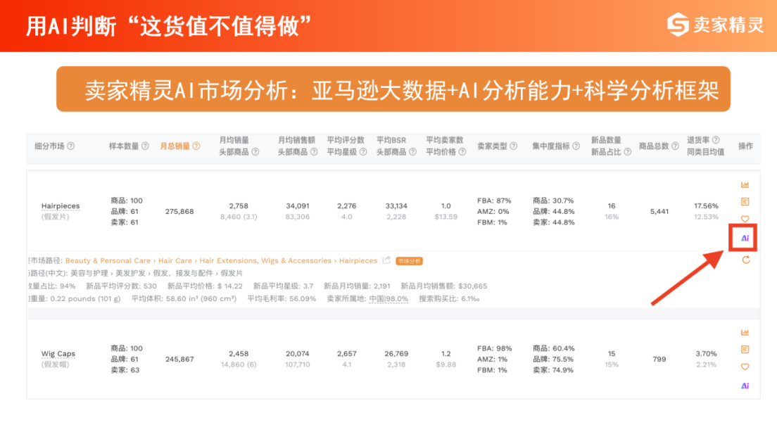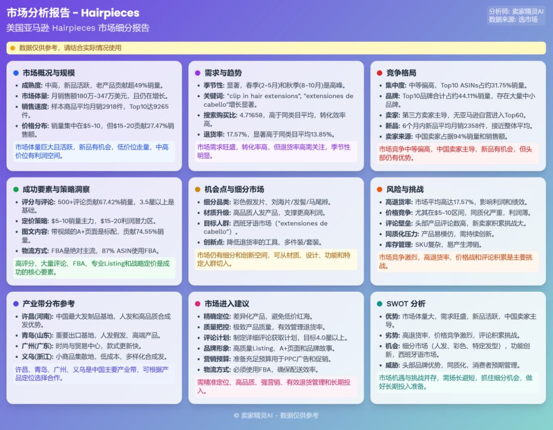 找到细分市场后,再用卖家精灵的AI市场分析功能,系统1分钟生成市场报告,自动展示规模、趋势、竞争格局、细分机会等9大维度数据信息。比如说,下面报告显示假发片这个市场的市场体量大,价格两极分化,季节性还很强,市场还有细分和功能创新空间,可以从真人发、时尚色、特定场景和配件切入等。几分钟,就能判断它是不是你能做的市场