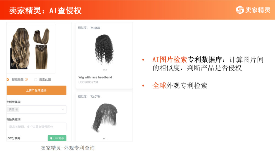 接着,卖家精灵Wendy提到跨境卖家比较头疼的事——产品外观专利。针对这块,卖家精灵外观专利查询,通过AI能帮助大家快速智能识别潜在风险,降低出海隐患等。