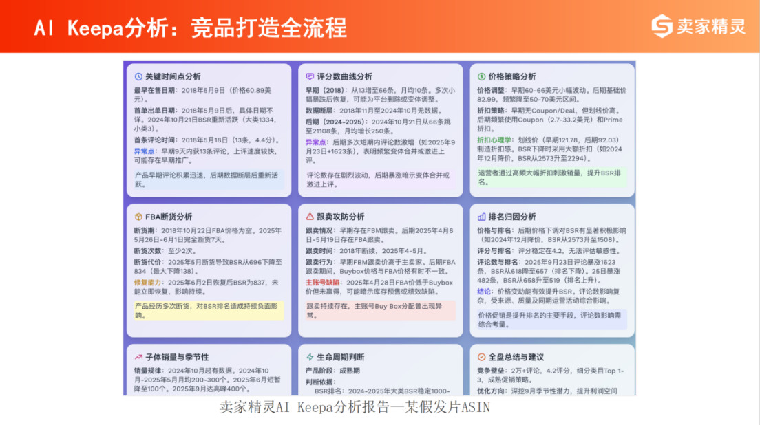 卖家在确定市场后,通过卖家精灵AI Keepa分析,能分析竞品的价格、销量、排名趋势,并快速识别出进入“爆发前期”的高潜力产品。让选品决策不再依赖感觉,而是基于数据。