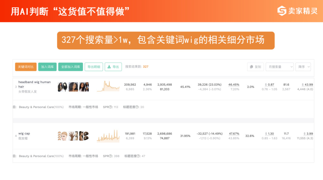 随即,卖家精灵Wendy提到很多卖家&工厂朋友的困惑:“怎么判断某个产业带的货,在海外市场到底值不值得做?” “哪些产品机会更大,风险又在哪?该怎么切入市场?”现在,AI+大数据能完美地解决这个问题。以“假发”类目为例,通过卖家精灵关键词选品搜索,会发现搜索量超过1万的相关市场就有300多个,从“假发帽”“假发片”到“半真半假假发”,每一个关键词背后,都是一个细分市场。