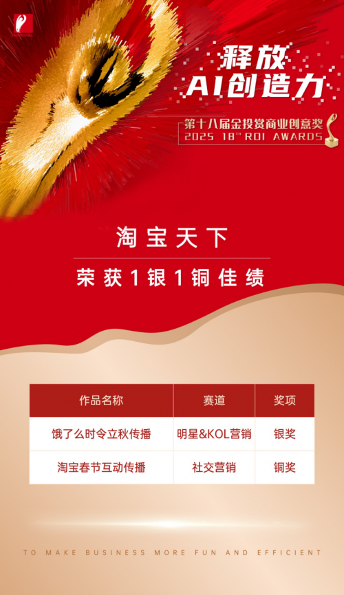 2025第十八届金投赏商业创意奖共收到来自943家顶尖公司的2420件参赛作品。今年淘宝天下首度参赛,旗下两个案例:“饿了么时令立秋传播”“淘宝春节传播”分别荣获明星&KOL营销银奖、社交营销铜奖各一座!这不仅是淘宝天下品牌营销实力的权威认证,更是团队将创意转化为商业价值能力的充分证明。