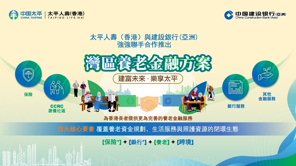 2025年,太平人寿(香港)与建设银行(亚洲)强强联手,合作推出“港人湾区养老金融方案”,以“建富未来 乐享太平”为主题,整合保险、银行、养老和跨境四大核心要素,进一步拓展了服务维度,透过“养、居、享、医、乐”五大领域,构建覆盖养老资金规划、生活服务与照护资源的闭环生态,为港人北上湾区养老提供更为完善的养老金融服务。