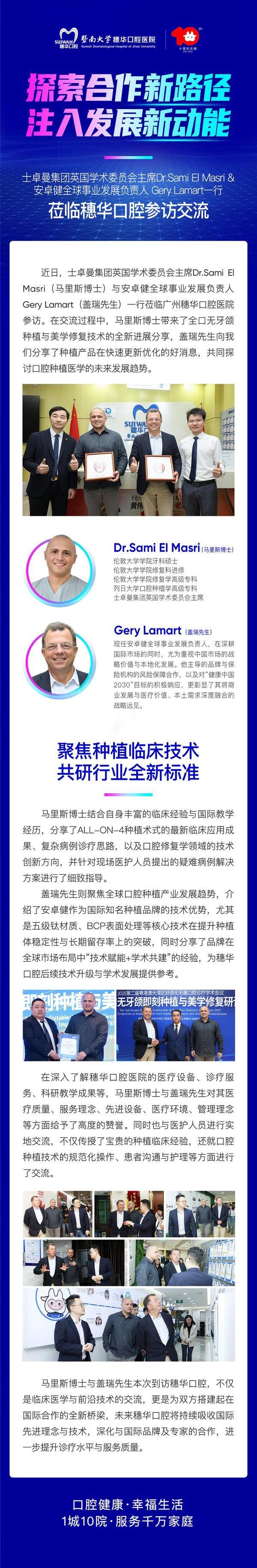 近日,士卓曼集团英国学术委员会主席 Dr.Sami El Masri(马里斯博士)与安卓健全球事业发展负责人 Gery Lamart(盖瑞先生)一行莅临广州穗华口腔医院参访。在交流过程中,马里斯博士带来了全口无牙颌种植与美学修复技术的全新进展分享,盖瑞先生向我们分享了种植产品在快速更新优化的好消息,共同探讨口腔种植医学的未来发展趋势。