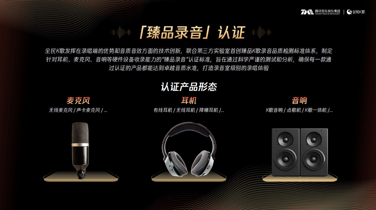 值得一提的是,全民K歌于今年正式推出「臻品录音」认证体系,旨在通过科学严谨的测试和分析,确保认证产品都能达到卓越音质水准,为用户打造录⾳室级别的录唱体验。该体系联合第三方声学实验室首创硬件设备收录能力认证标准,涵盖耳机、麦克风、音响等移动设备,依托国际先进测试仪器对频响范围、信噪比等核心参数进行客观评测,并面向品牌方提供详细的「臻品录音」认证测试报告。目前,全民K歌已与vivo、小米、雷鸟创新等前沿智能设备生产商合作推出多款「臻品录音」认证设备,同时正积极拓展与华为、倍思、红米、猛犸、拜亚动力等品牌的合作,持续推动移动K歌行业迈入软硬件深度协同新阶段。