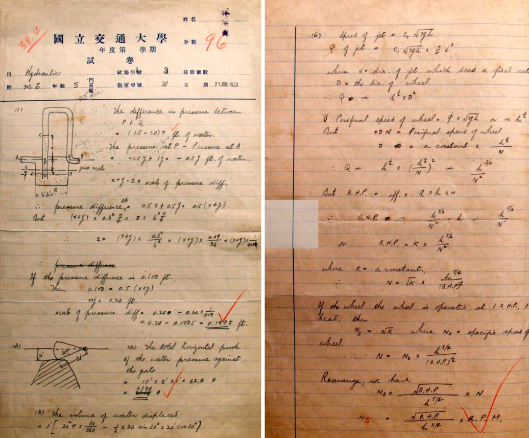 这份试卷卷首时间为1933年6月,课程是水力学,考生是钱学森。这次考试难度很大,而钱学森6道题全部解答正确,只在最后一题,公式推导中“Ns”漏写了一个“s”,被扣去4分。